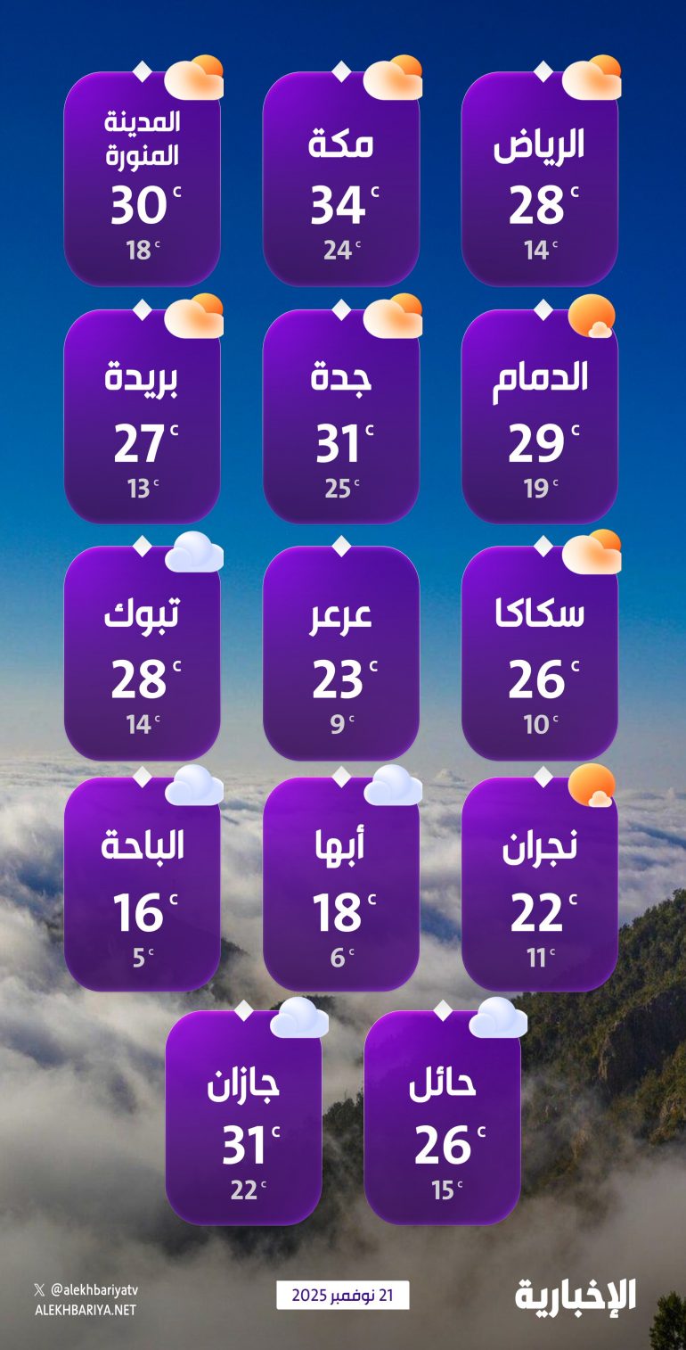 توقّع المركز الوطني للأرصاد في تقريره عن حالة الطقس هذا اليوم -بمشيئة الله تعالى- رياحًا نشطة مثيرة للأتربة والغبار، تحد من مدى الرؤية الأفقية، على مناطق مكة المكرمة والمدينة المنورة وتبوك وعسير والباحة، كما لا يستبعد تكوّن الضباب خلال الليل وساعات الصباح الباكر على المنطقة الشرقية.