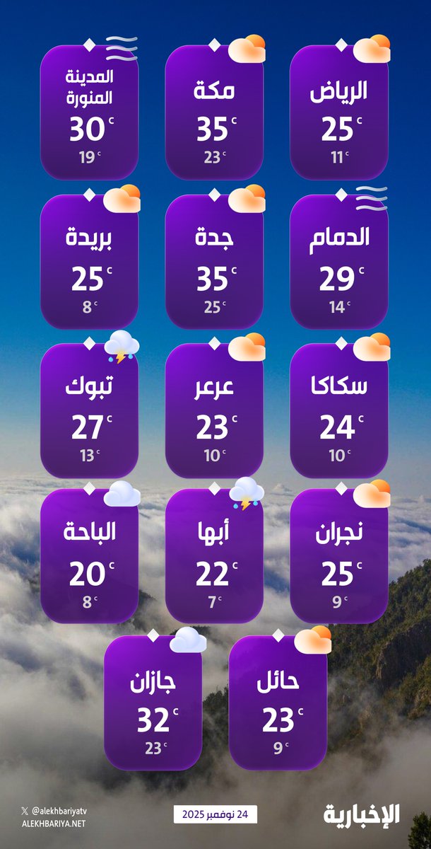 توقع المركز الوطني للأرصاد عن حالة الطقس اليوم -بمشيئة الله تعالى- سماء غائمة جزئيًا، يتخللها سحب رعدية ممطرة مصحوبة برياح نشطة على أجزاء من مرتفعات منطقتي جازان وعسير، ولا يستبعد تكون الضباب خلال الليل وساعات الصباح على تلك المناطق وأجزاء من المنطقة الشرقية. كما يتوقع هطول أمطار رعدية متوسطة إلى غزيرة تؤدي إلى جريان السيول مصحوبة بزخات من البرد ورياح نشطة خلال الليل وساعات الصباح لليوم التالي على أجزاء من منطقة تبوك مع تكون الضباب.