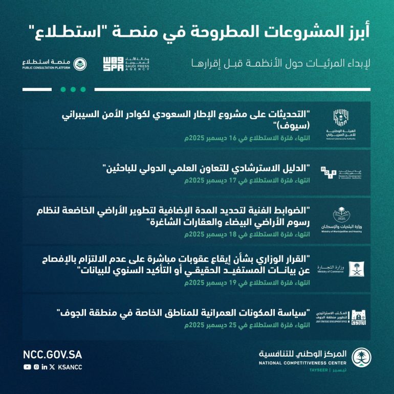 وشهدت المنصة طرح مشروع “القرار الوزاري بشأن إيقاع عقوبات مباشرة على عدم الالتزام بالإفصاح عن بيانات المستفيد الحقيقي أو التأكيد السنوي للبيانات”؛ الذي تهدف من خلاله وزارة التجارة إلى تعزيز الامتثال بمتطلبات قواعد المستفيد الحقيقي، وتحسين أدوات الإشراف وضبط المخالفات، وتحقيق العدالة في إيقاع الغرامات، وينتهي الاستطلاع على المشروع بتاريخ 19 ديسمبر 2025م.