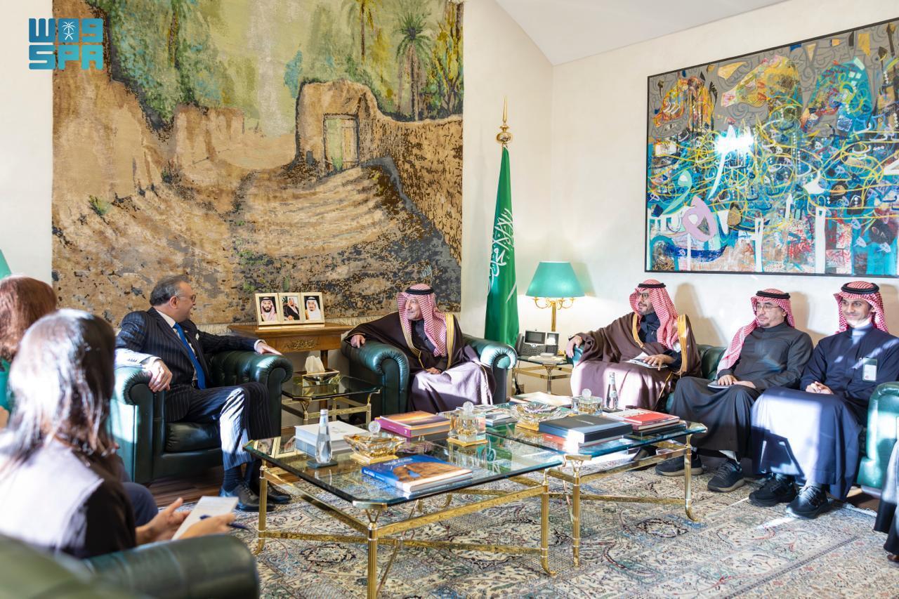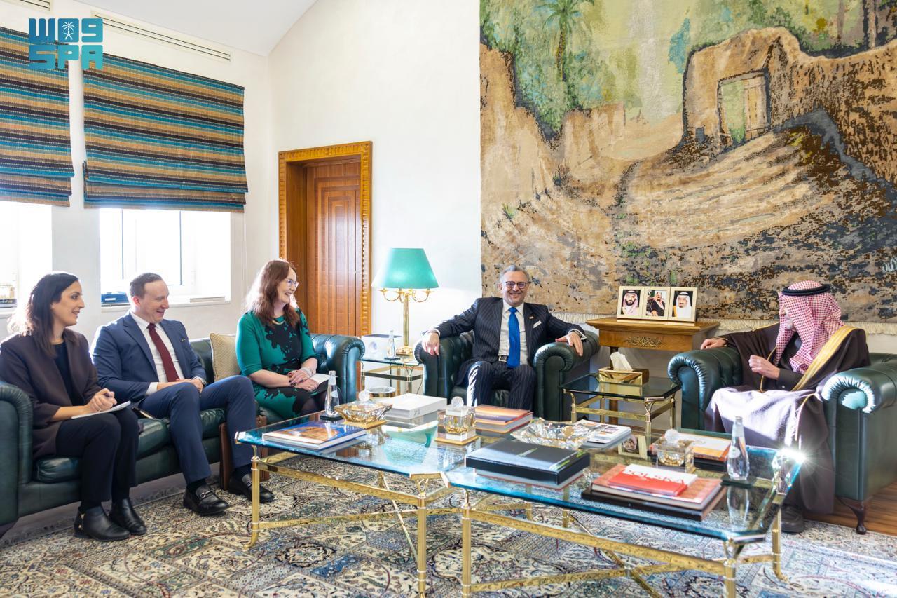 حضر الاستقبال، سمو مستشار وزير الخارجية للشؤون السياسية الأمير مصعب بن محمد الفرحان، والقائم بالأعمال في سفارة الولايات المتحدة الأمريكية لدى المملكة السيدة أليسون ديلورث.