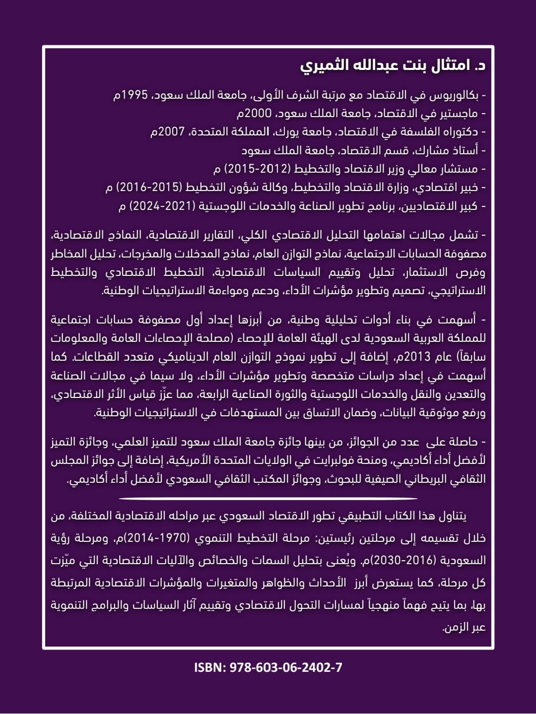 صدر للدكتورة امتثال بنت عبدالله الثميري كتاب ( الاقتصاد السعودي .. من التأسيس إلى الرؤية ) ، تناولت فيه تطور الاقتصاد السعودي عبر مراحله الاقتصادية المختلفة ، من خلال تقسيمه إلى مرحلتين رئيسيتين : مرحلة التخطيط التنموي ( 1970 – 2014 م ) ، ومرحلة رؤية السعودية ( 2016 – 2030م ) .