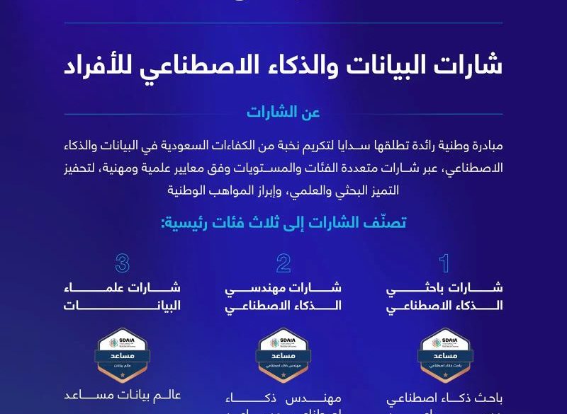 وتأتي المبادرة بوصفها أول إطار وطني منهجي لتكريم الباحثين والمهندسين في البيانات والذكاء الاصطناعي في المملكة، ومنظومة شارات متعددة الفئات تعكس تطور المسار العلمي والمهني والقيادي، تعتمد على معايير تقييم مبنية على أفضل الممارسات العالمية.