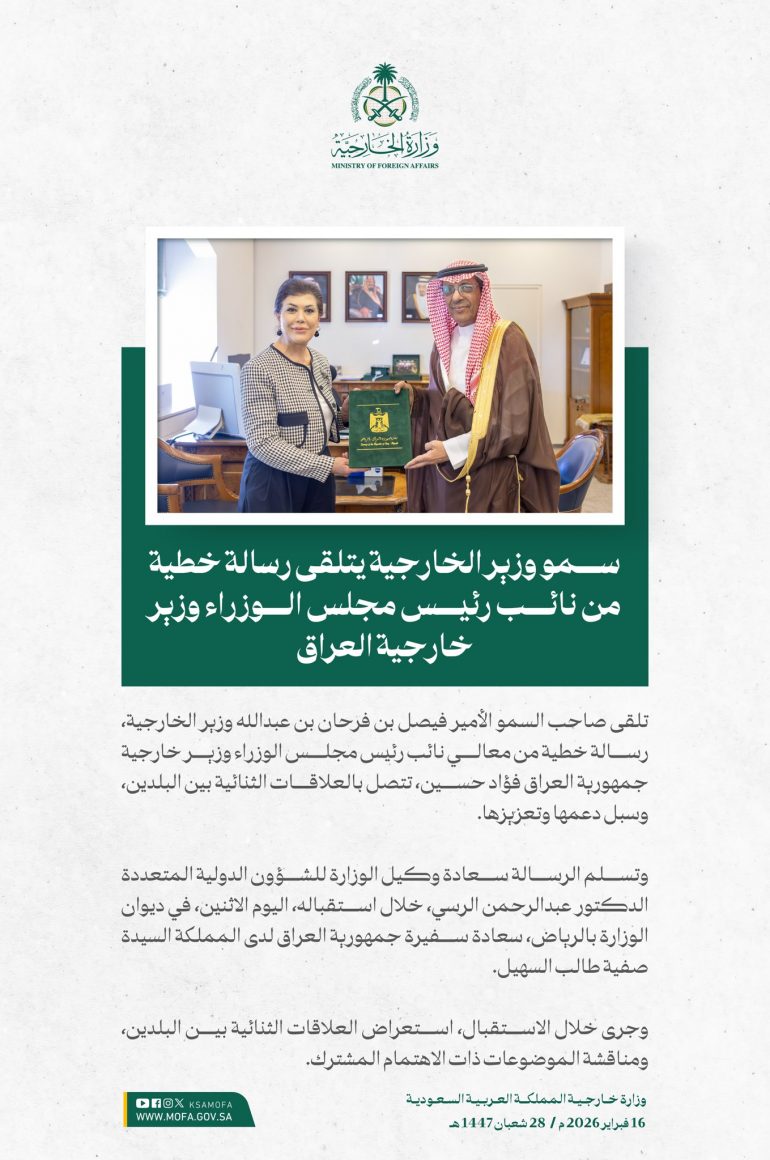 تلقى صاحب السمو الأمير فيصل بن فرحان بن عبدالله وزير الخارجية، رسالة خطية، من معالي نائب رئيس مجلس الوزراء وزير خارجية جمهورية العراق فؤاد حسين، تتصل بالعلاقات الثنائية بين البلدين وسبل دعمها وتعزيزها. تسلم الرسالة وكيل الوزارة للشؤون الدولية المتعددة الدكتور عبدالرحمن الرسي، خلال استقباله بمقر الوزارة بالرياض اليوم، سفيرة جمهورية العراق لدى المملكة صفية طالب السهيل. وجرى خلال الاستقبال استعراض العلاقات الثنائية بين البلدين، ومناقشة الموضوعات ذات الاهتمام المشترك