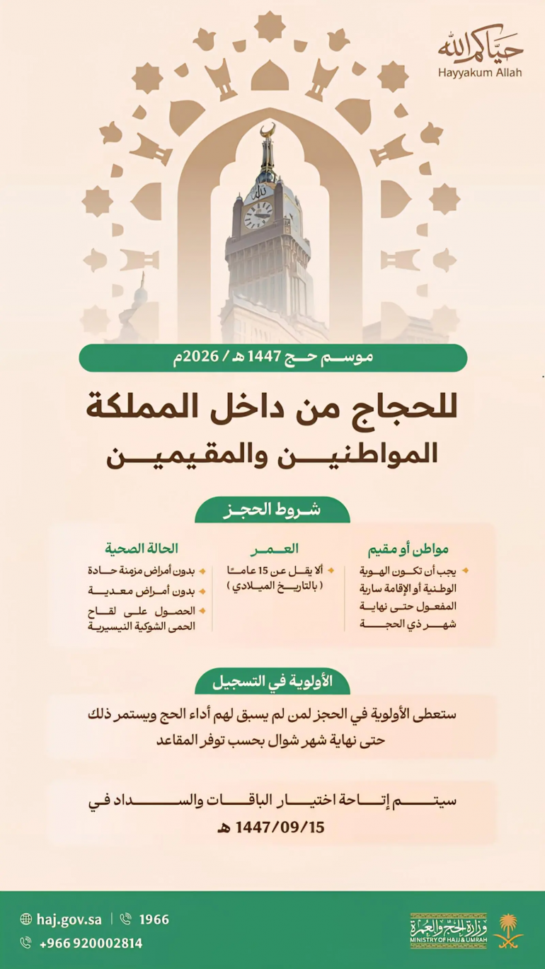 فتحت وزارة الحج والعمرة التسجيل للراغبين في الحج من داخل المملكة (المواطنين والمقيمين ممن لديهم إقامة سارية)، عبر تطبيق نسك والموقع الإلكتروني https://www.nusuk.sa/ ابتداءً من 6 رمضان 1447هـ، على أن يبدأ حجز الباقات في 15 رمضان.