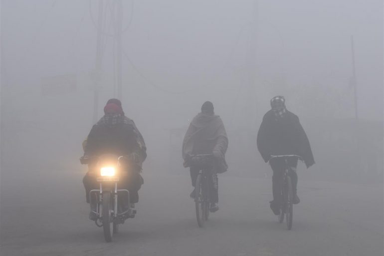 مواطنون هنود على متن دراجات هوائية يشقون طريقهم وسط ضباب دخاني كثيف في ضواحي مدينة أمريستار.... Read More